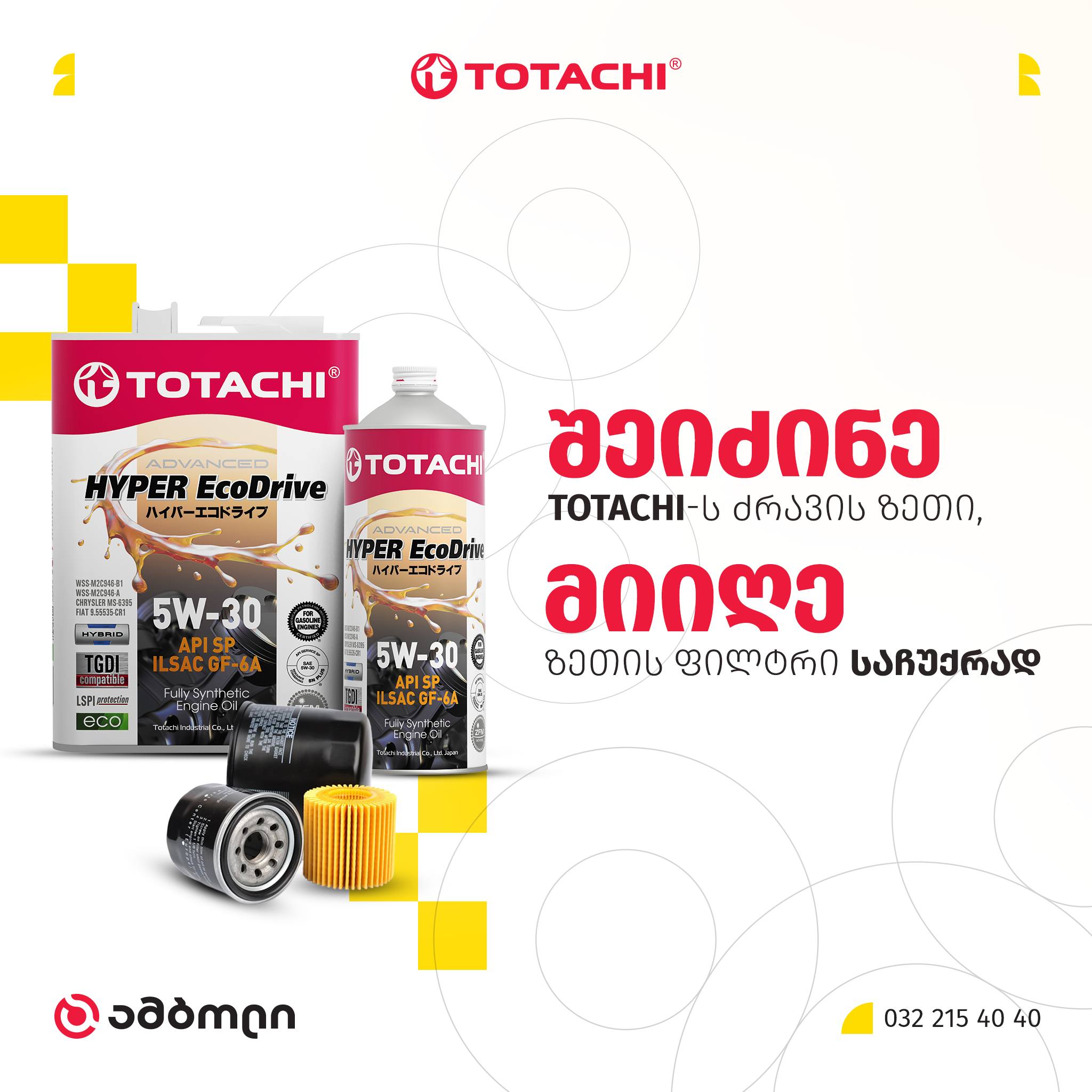 მოდი ამბოლის ნებისმიერ ფილიალში, შეცვალე ძველი ახალი, Totachi-ის ძრავის ზეთით და მიიღე ფილტრი საჩუქრად.