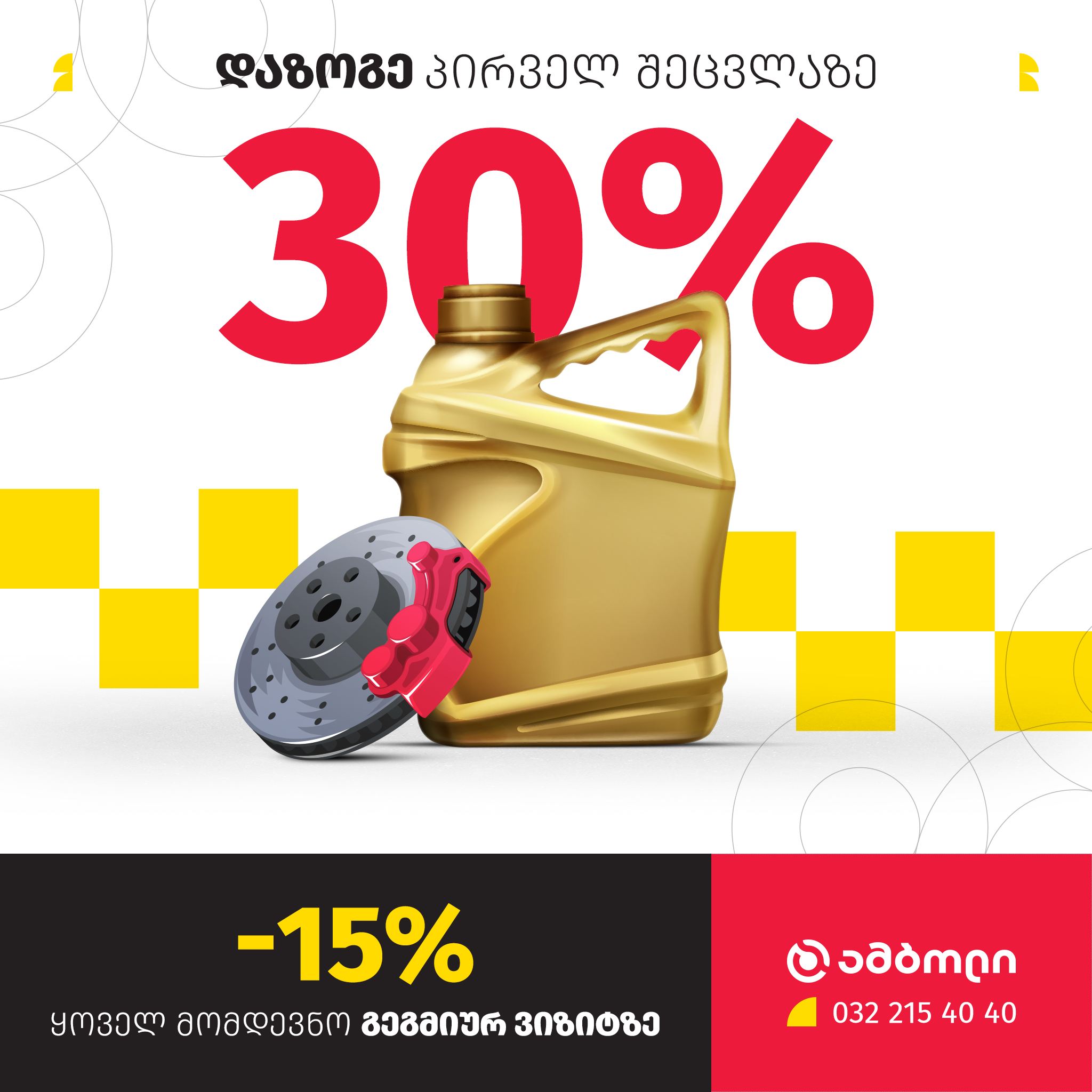 ამასთანავე, თუკი ამბოლში ძრავის ზეთის ან ხუნდის შეცვლის სერვისით ჯერ კიდევ არ გისარგებლია, მაშინ 30%-იან ფასდაკლებას მიიღებ, ხოლო მომდევნო გეგმიურ ვიზიტზე კი შეძლებ 15%-იანი ფასდაკლებით ისარგებლო.