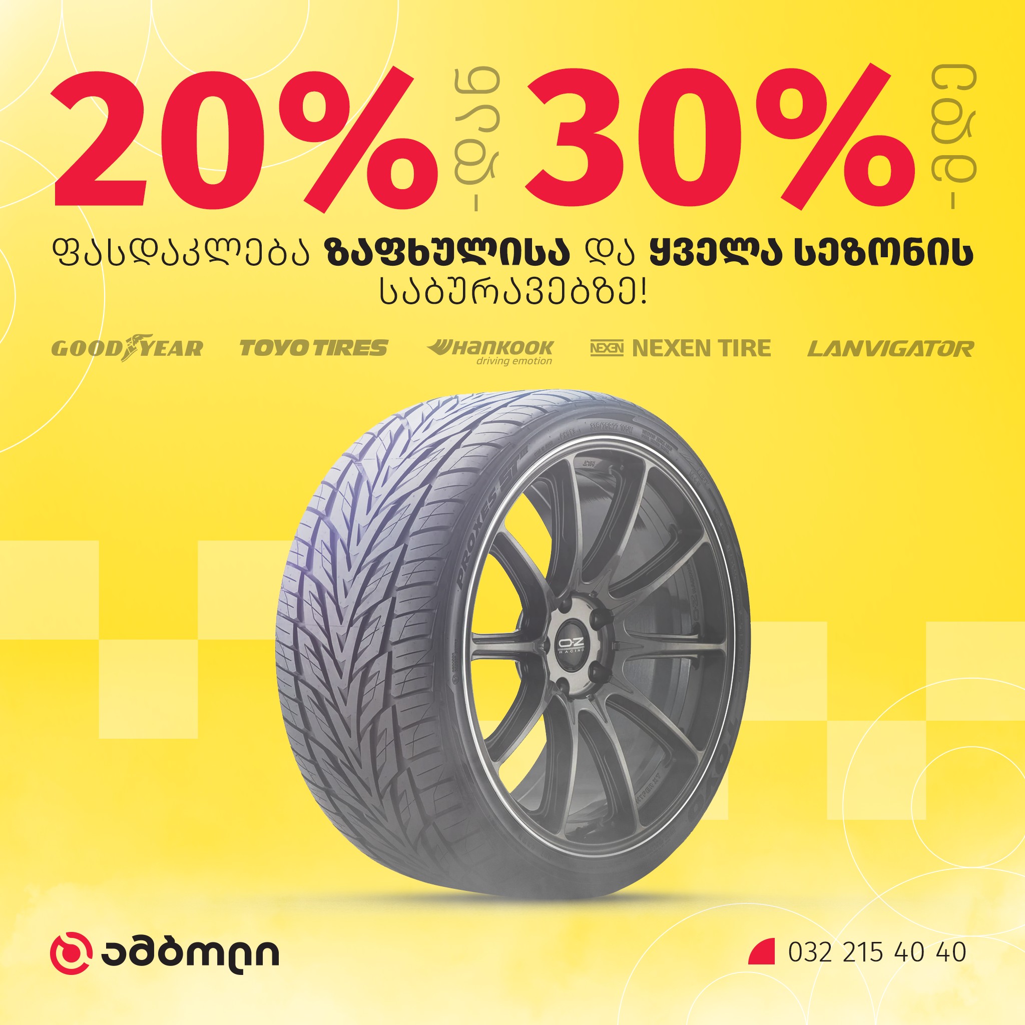 - 30%-იანი ფასდაკლება Goodyear-ის, Toyo-სა და Hankook-ის საბურავებზე.